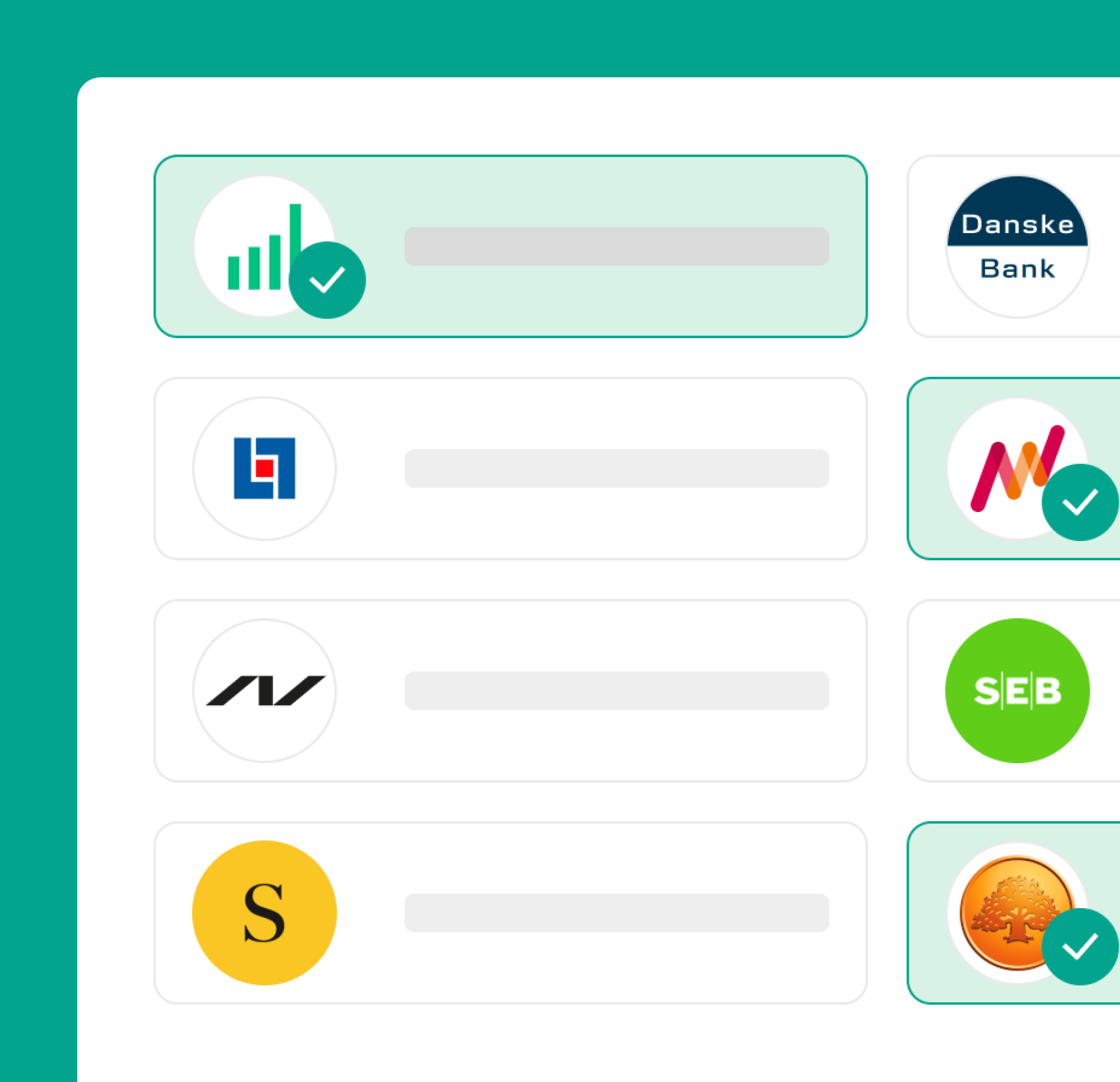 With a few lines of code you display our widgets in your system. Let the client pick what banks to collect data from. Using our admin tools this selection can be configured easily. If you already know what banks to get you can bypass this.